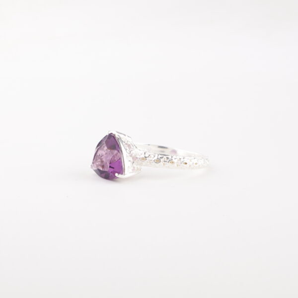 Unveil your radiance with the Sevara Amethyst Spark Ring, a breathtaking piece crafted in pure 925 sterling silver. This elegant ring features a vibrant trillion-cut amethyst gemstone, known for its captivating purple hue and symbolic connection to clarity, calmness, and inner strength.