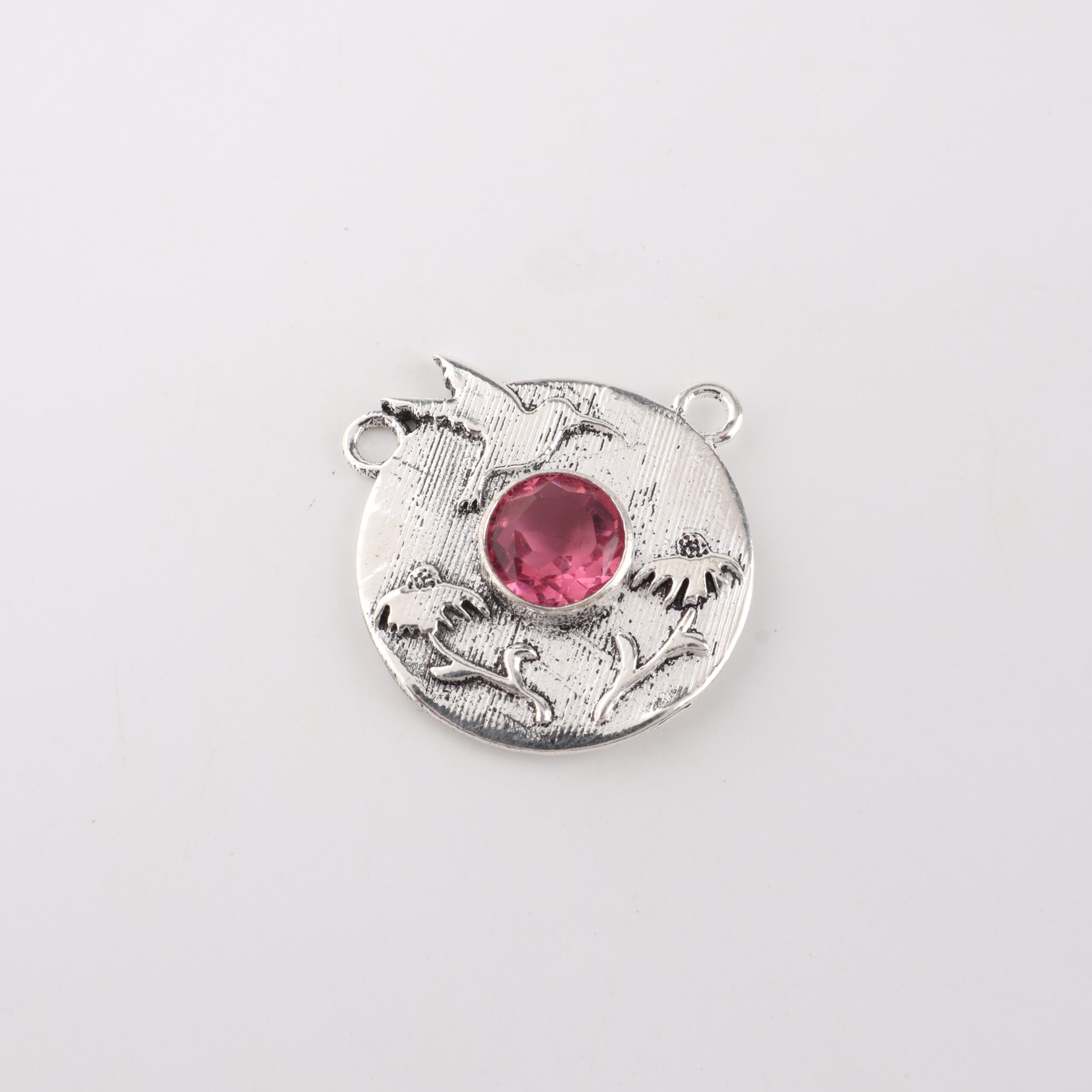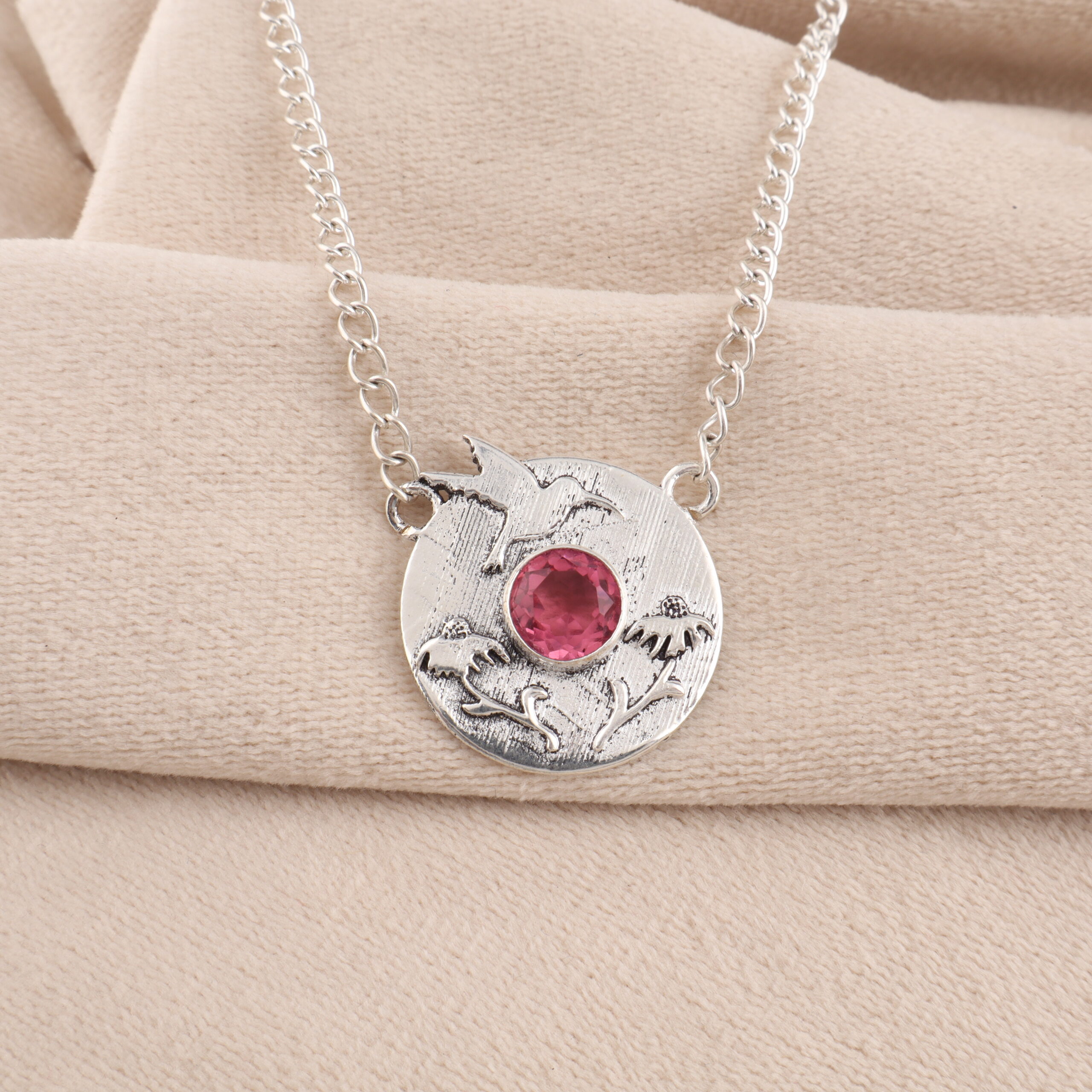 Beautifully crafted in pure 925 sterling silver, this pendant features a stunning pink gemstone surrounded by a graceful bird-and-floral design that symbolises freedom, hope and feminine beauty.