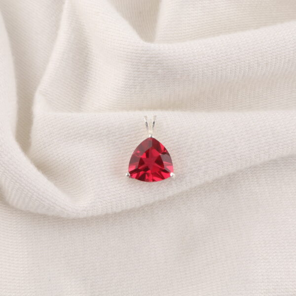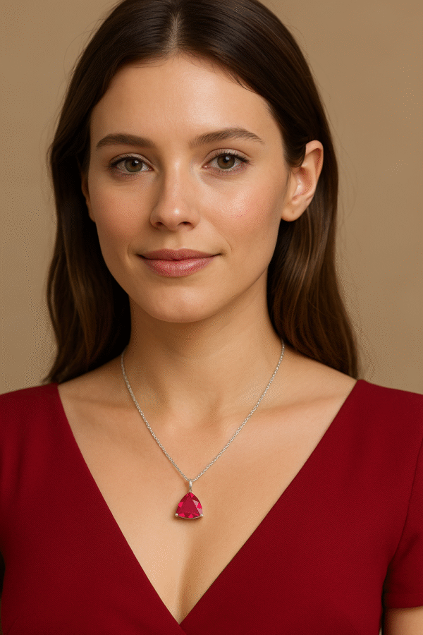 Introducing the Sevara Charm Pendant, a dazzling expression of elegance crafted in pure 925 Sterling Silver, featuring a striking triangular gemstone in a rich ruby-pink tone. Its clean prong setting enhances the gemstone’s brilliance, while the sleek chain creates a soft and graceful silhouette – perfect for everyday wear and special moments.