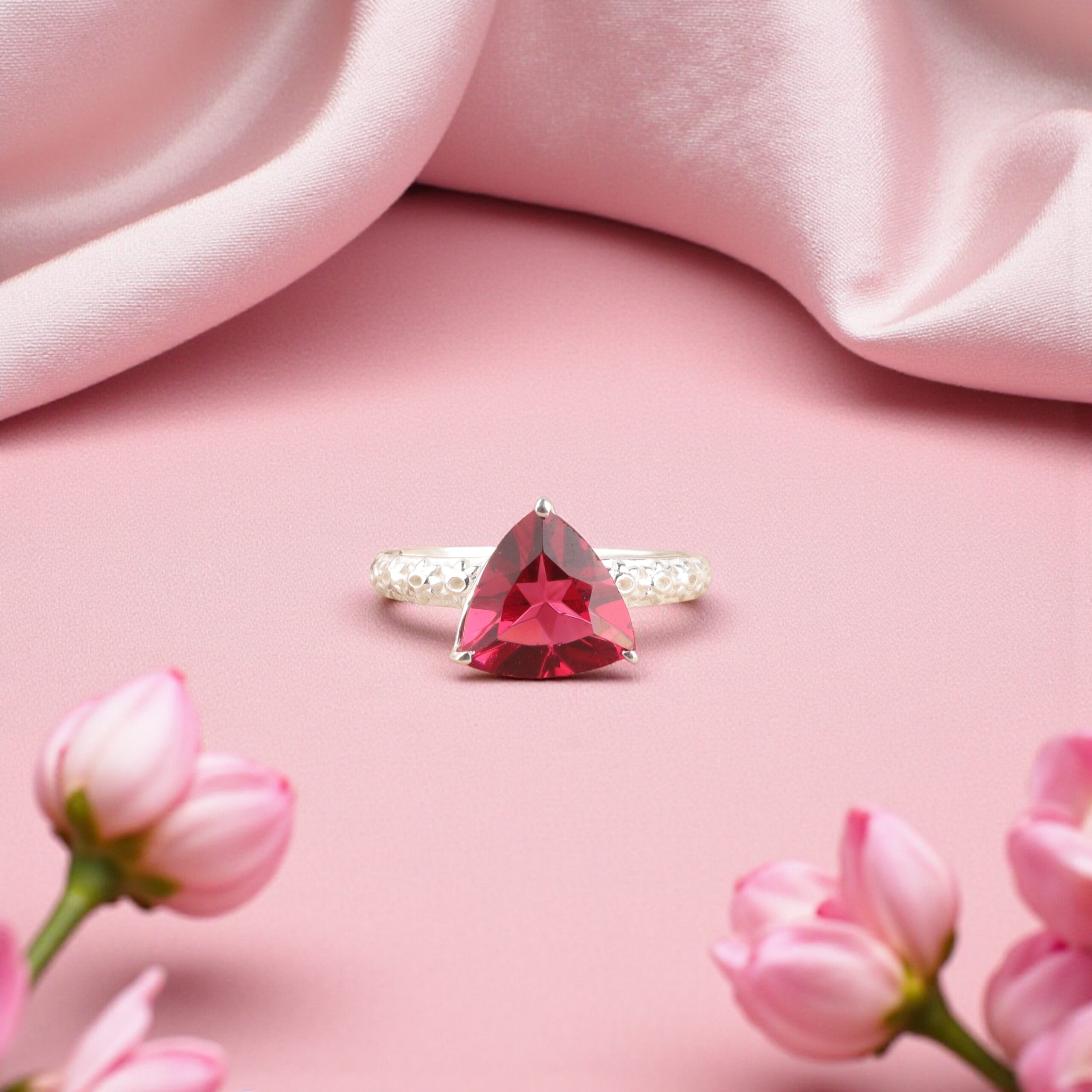 The Sevara Cherry Spark Ring is a beautiful expression of elegance and radiance, crafted in premium 925 sterling silver and adorned with a vibrant cherry-red gemstone. Its captivating trillion cut paired with a delicately detailed band makes it a standout piece—perfect for elevating both everyday style and special occasions.