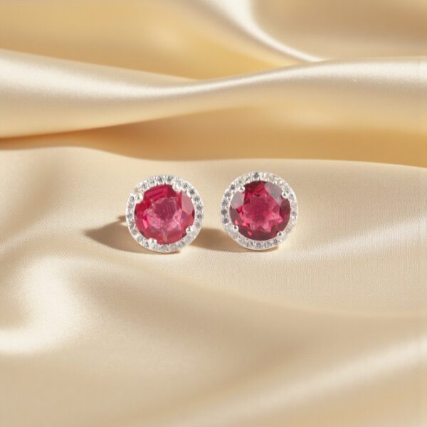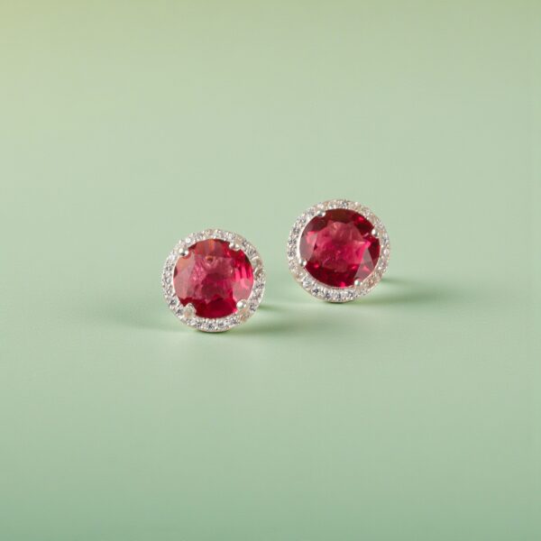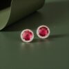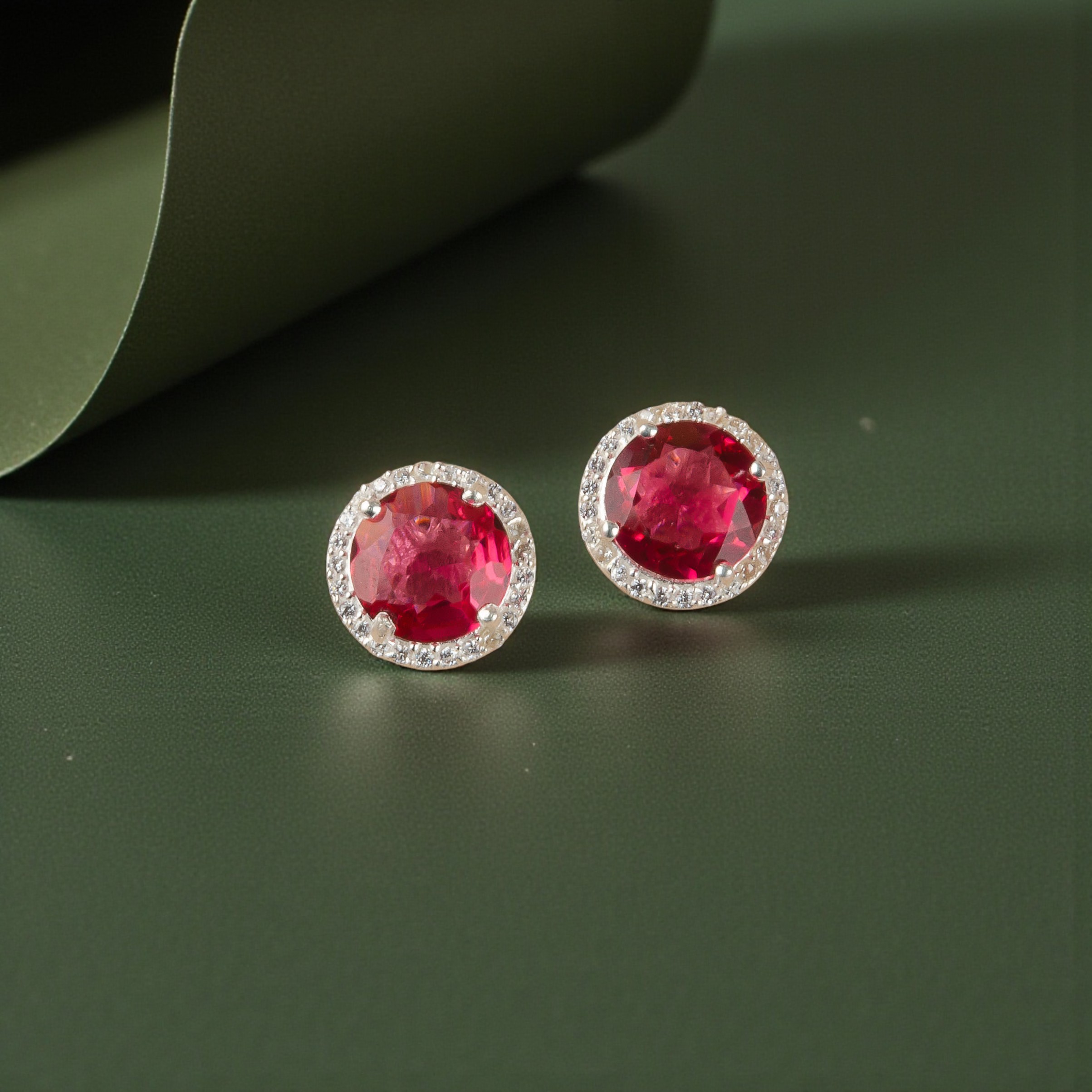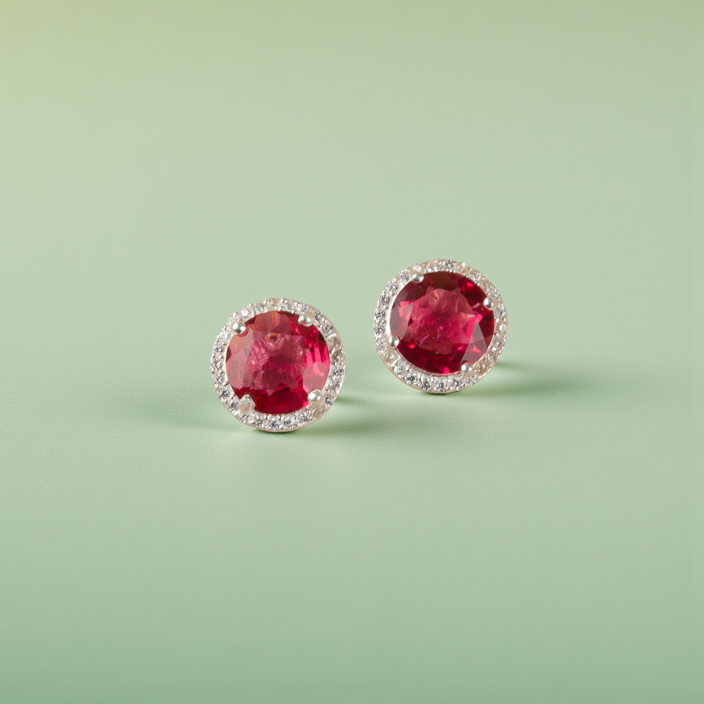 Introducing the Sevara Classic Halo Stud Earrings, a timeless pair crafted to bring effortless elegance to your style. These stunning studs feature radiant round-cut stones in a deep ruby pink hue, beautifully encircled by a shimmering halo of CZ diamonds—creating a luxurious and eye-catching sparkle.