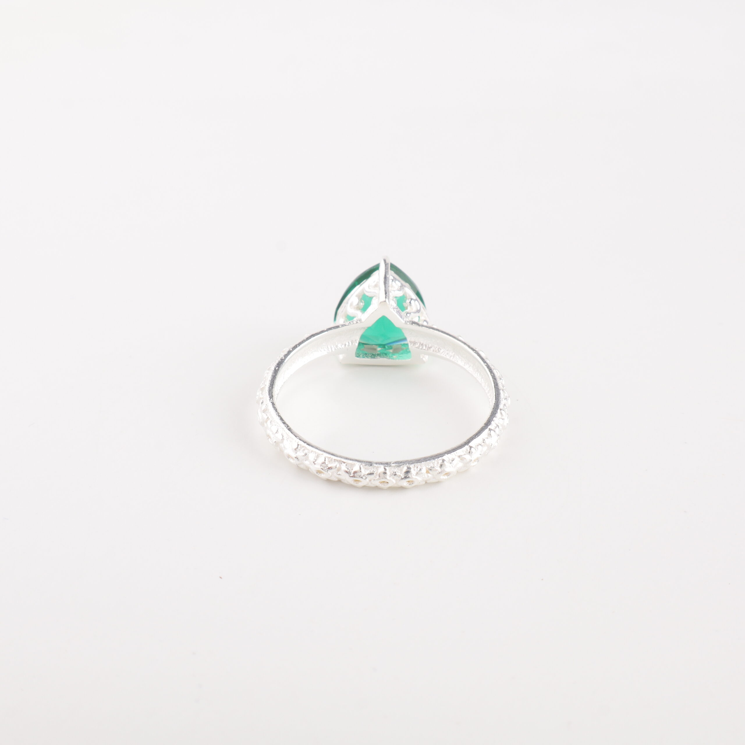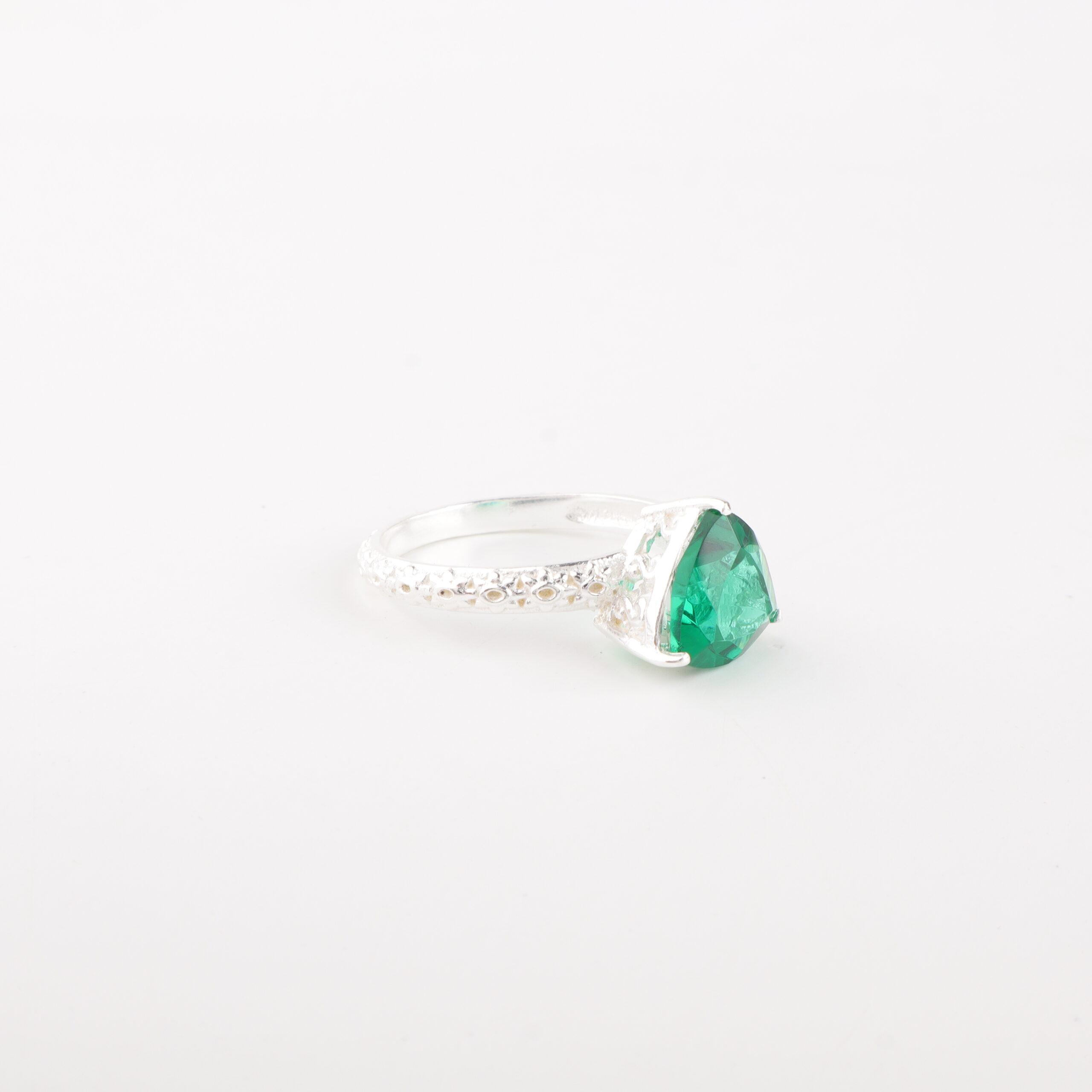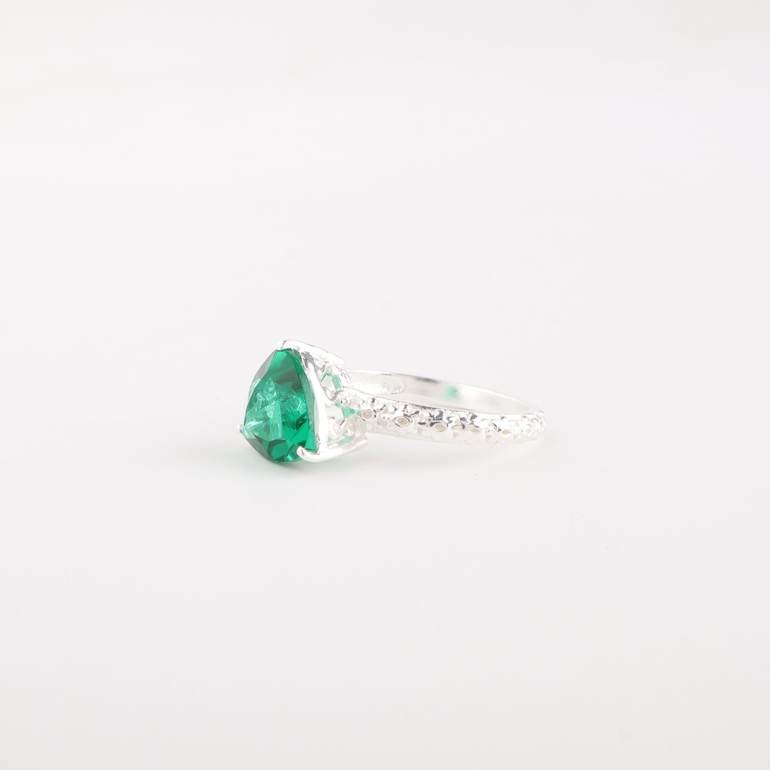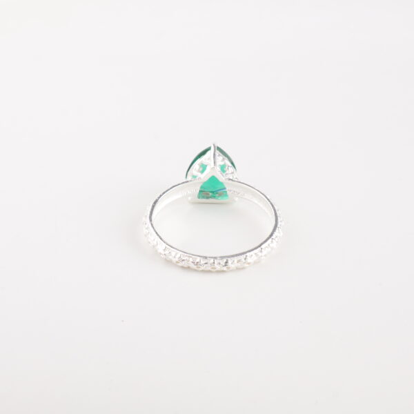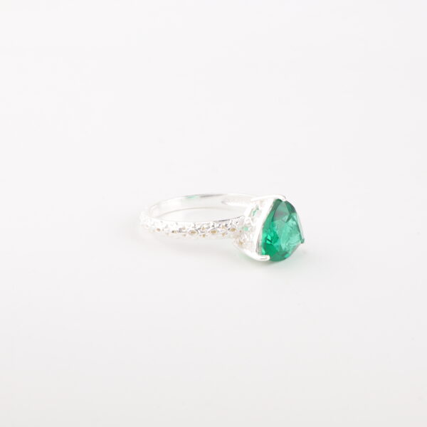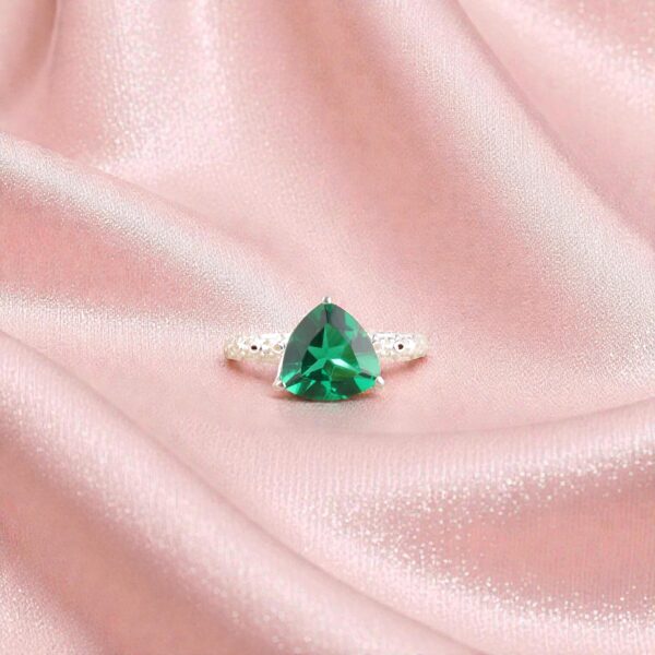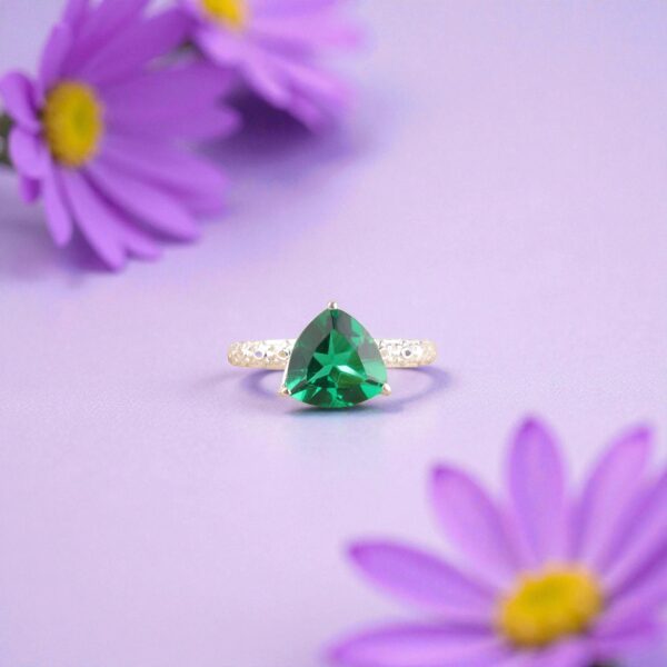 Introducing the Sevara Emerald Charm Ring, a stunning blend of timeless elegance and vibrant colour. Crafted in 925 sterling silver, this ring features a mesmerizing emerald-green gemstone cut in a brilliant triangular shape—radiant, modern, and captivating from every angle.