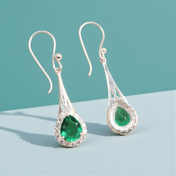 Introducing the Sevara Emerald Halo Drops, a breathtaking pair of earrings crafted in pure silver pendant-style detailing with sparkling halo accents that frame a brilliant teardrop-shaped emerald crystal. Each piece is made from premium 925 sterling silver, ensuring elegance, durability, and luxurious shine.