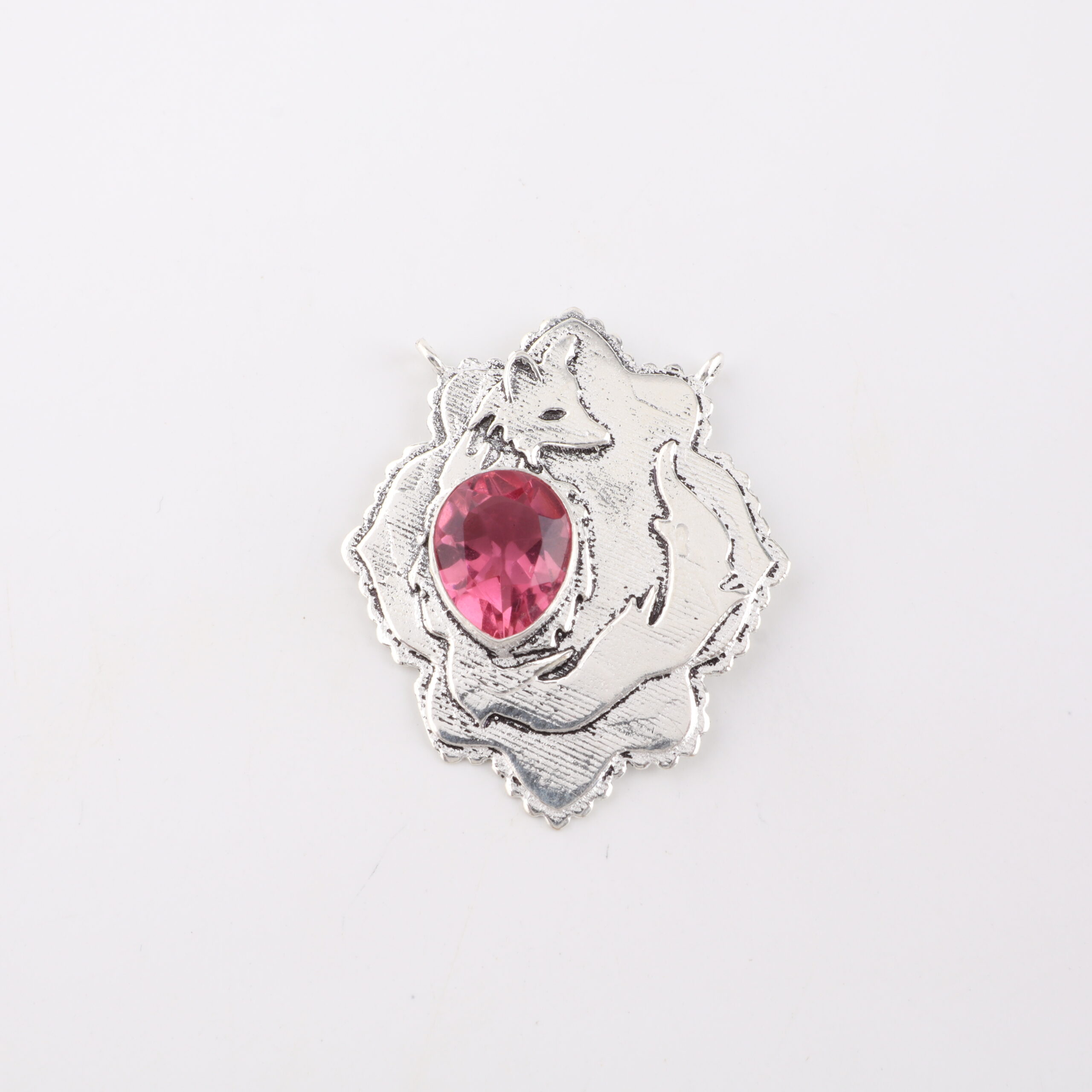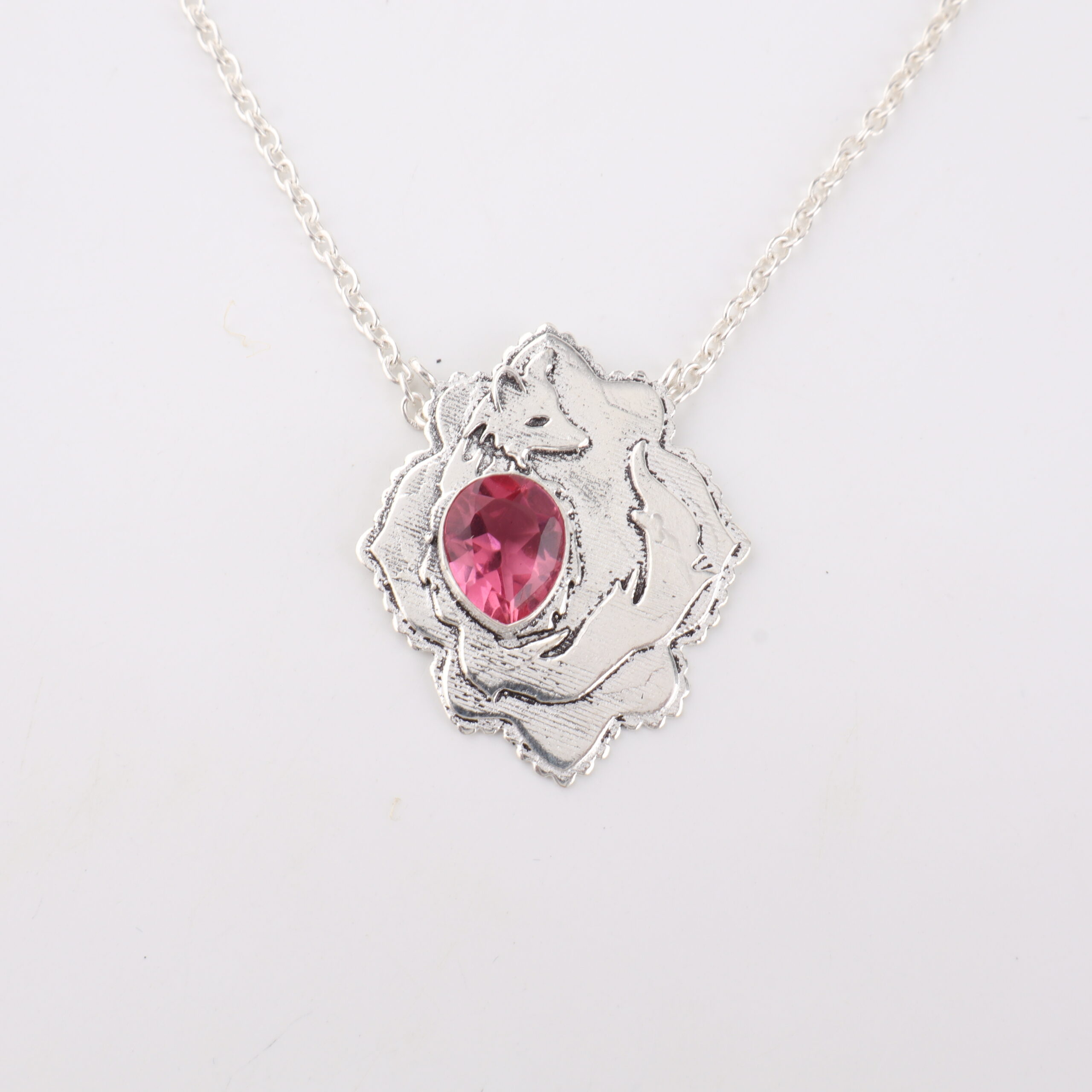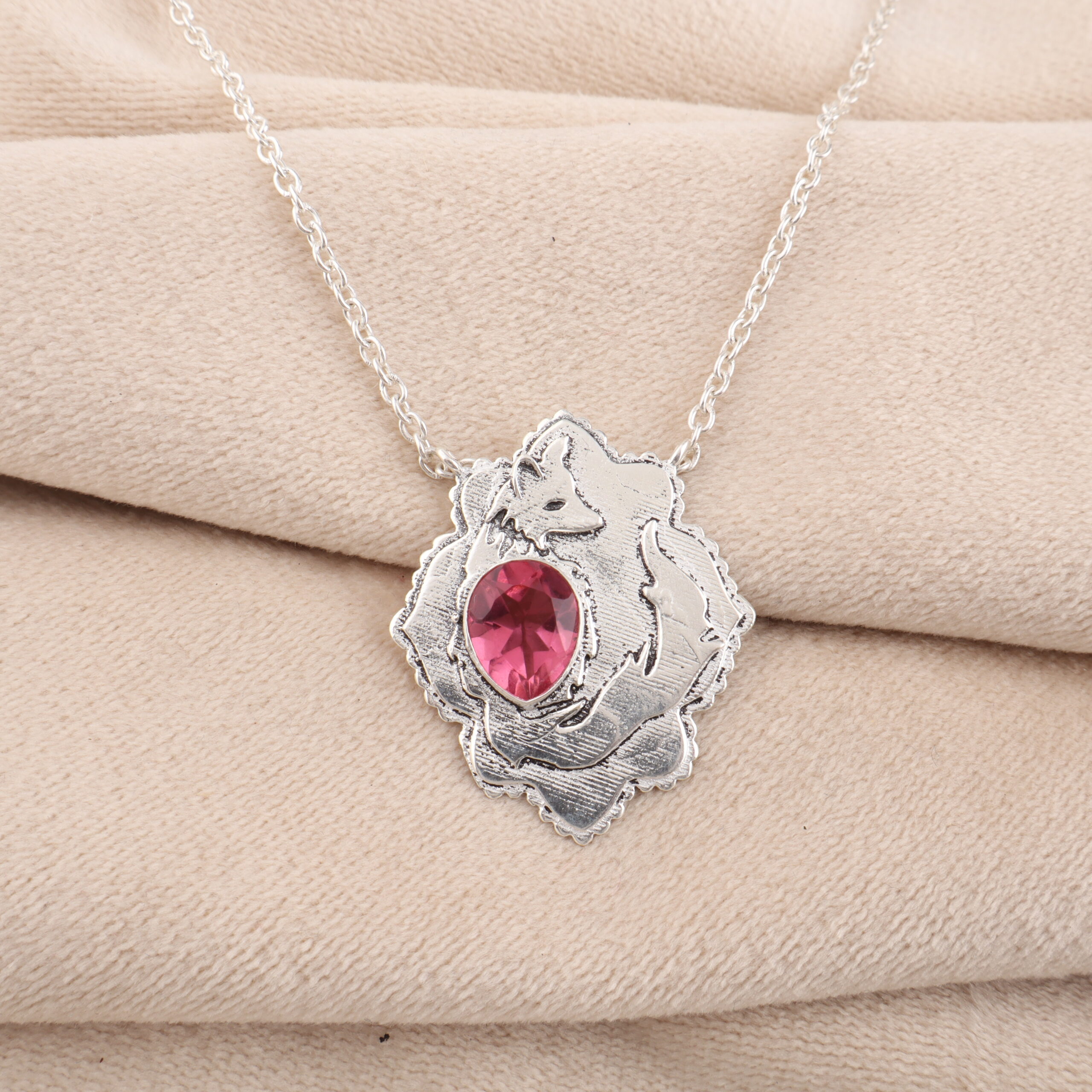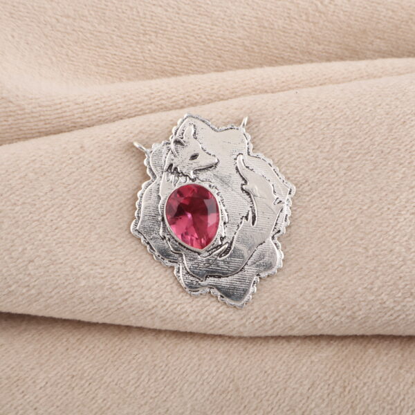 Introducing the Sevara Foxy Pink Pendant, a charming sterling silver piece with a stunning pink gemstone at the center — featuring a playful fox embracing the gem. ✨
