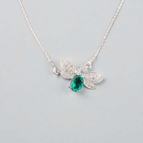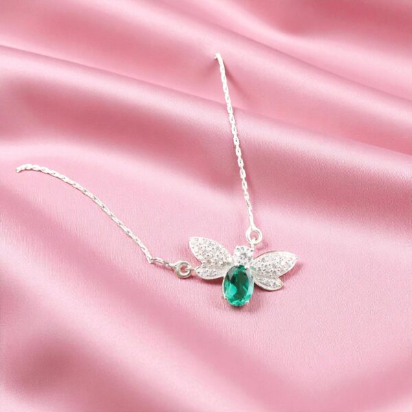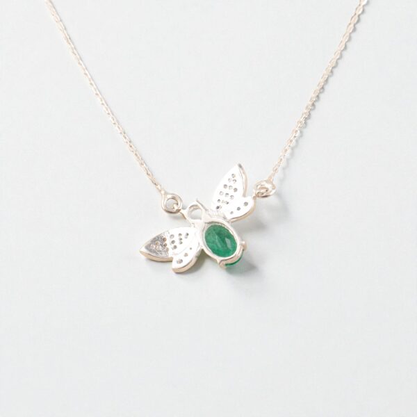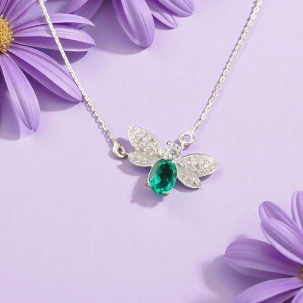 The centerpiece features a vivid green gemstone that adds a refreshing pop of colour, complemented by shimmering pave-set stones on the butterfly wings. Lightweight, beautifully detailed, and crafted for everyday comfort, this pendant is perfect for women who adore graceful, nature-inspired jewellery.