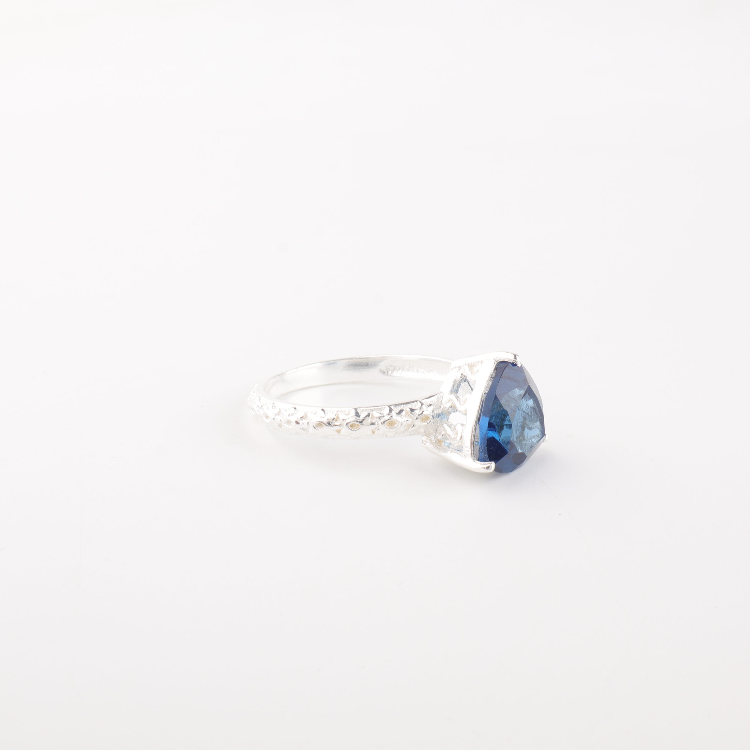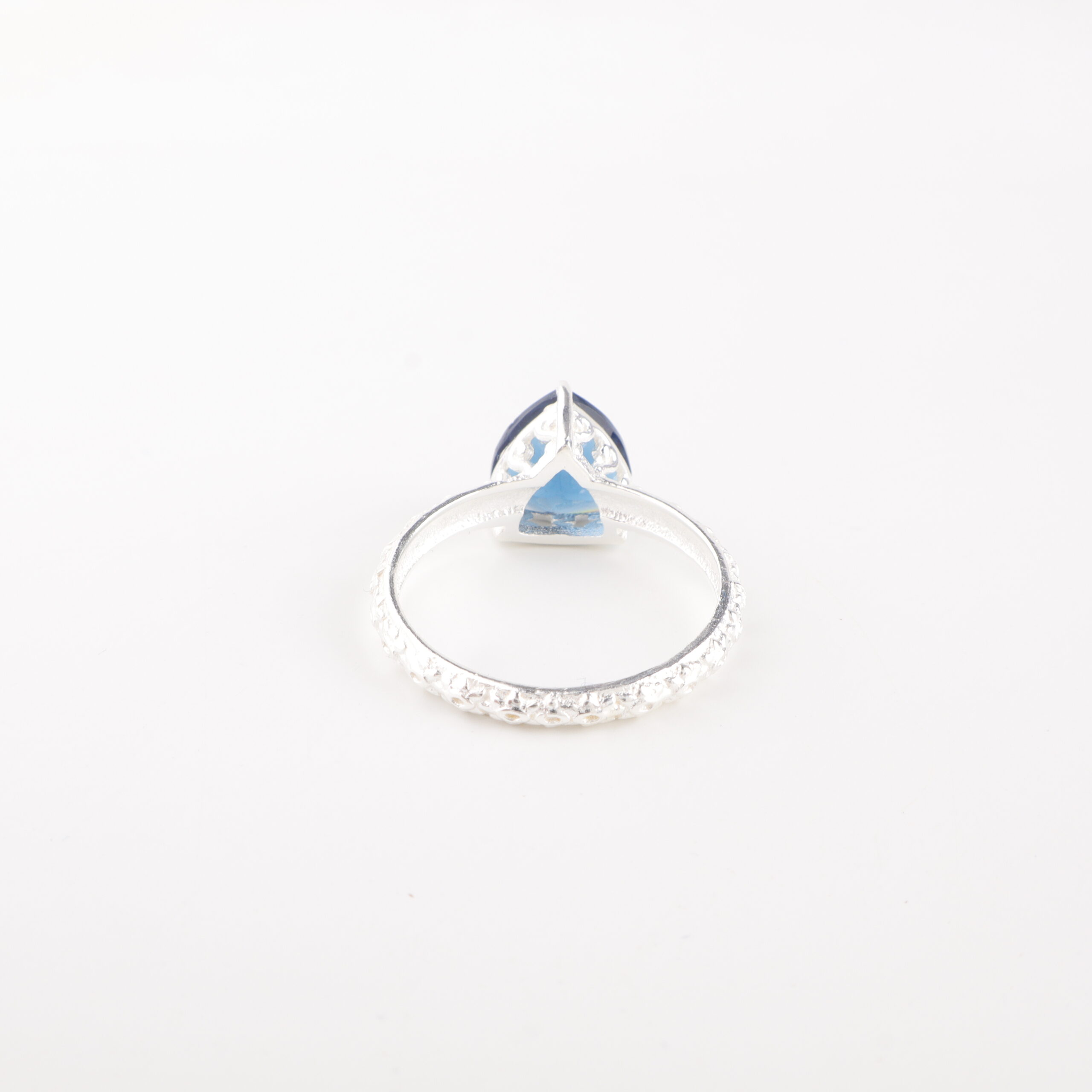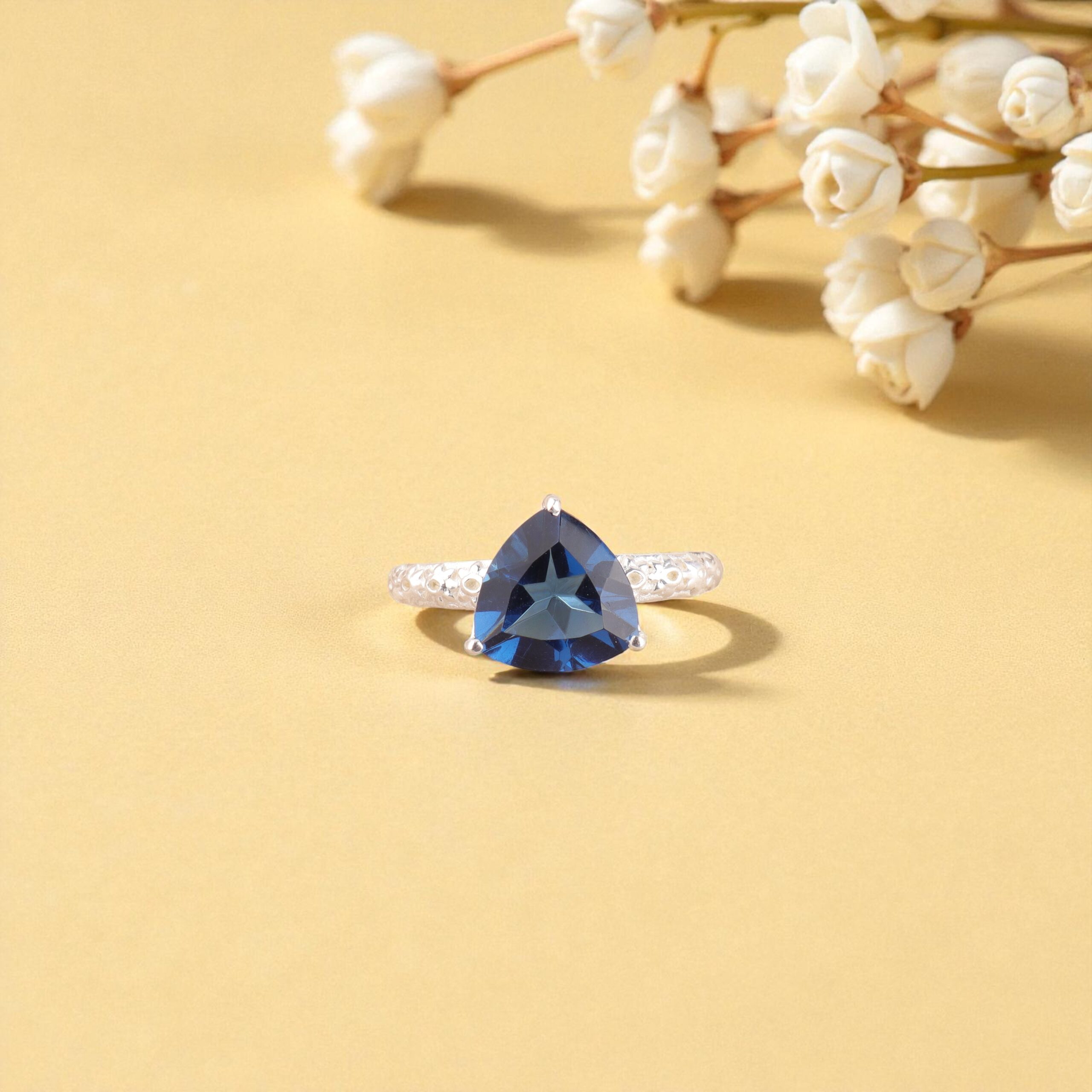 Ignite your elegance with the Sevara Ocean Flame Ring, a breathtaking piece featuring a brilliant triangle-cut deep ocean-blue gemstone set in pure 925 sterling silver. The vibrant blue stone symbolizes clarity, depth, and calm, making it an enchanting choice for everyday beauty and special celebrations.
