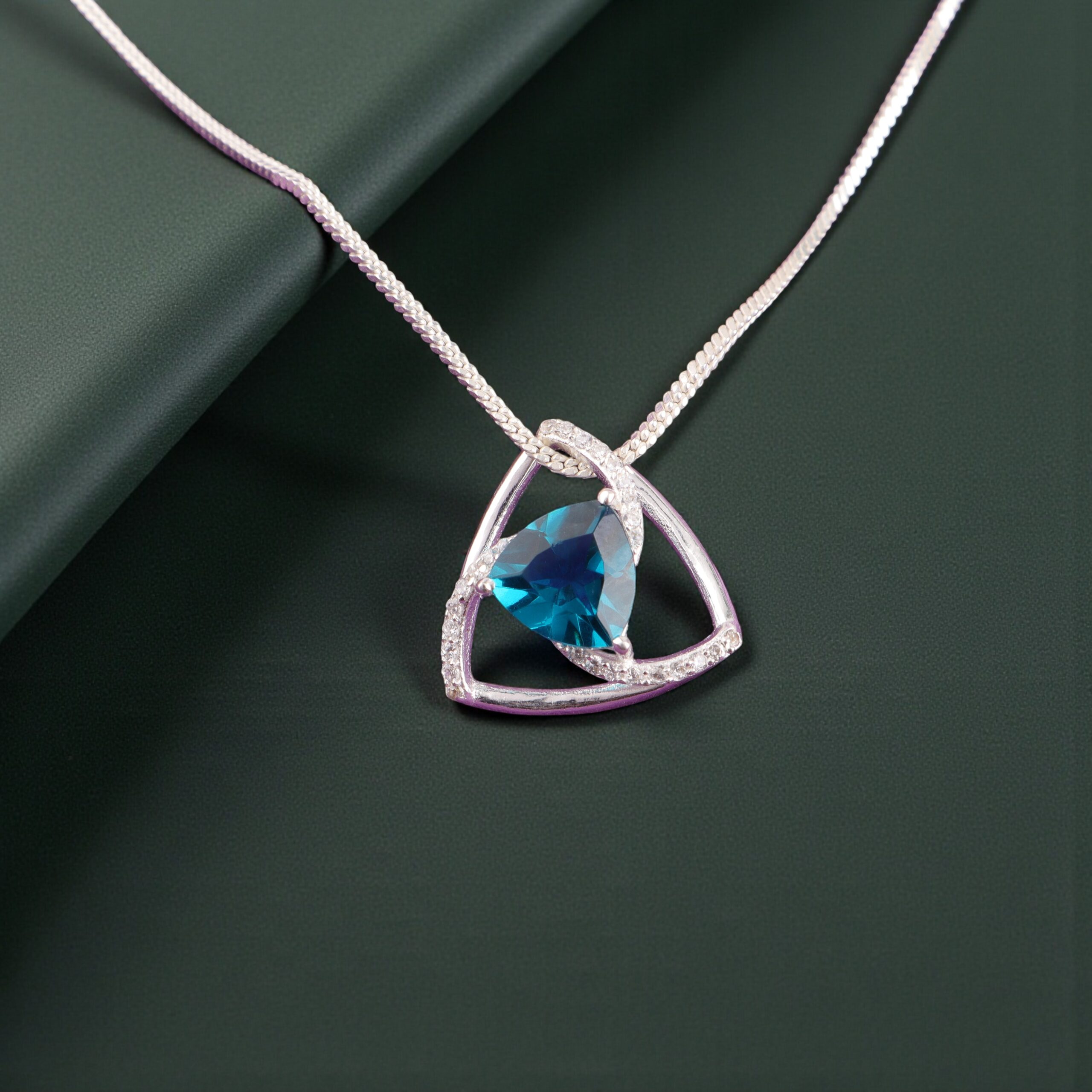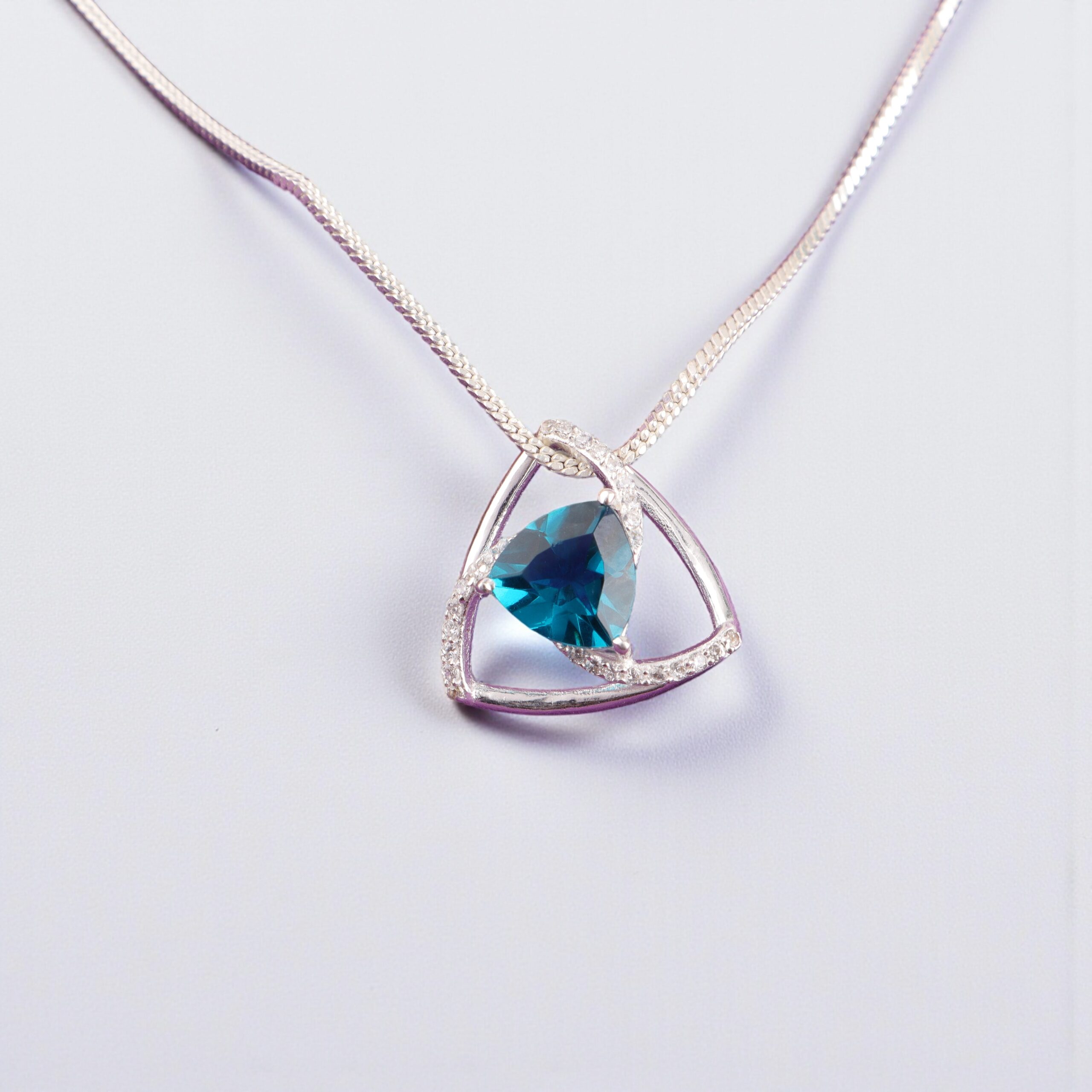 Dive into elegance with the Sevara Ocean Spark Pendant, crafted in premium 925 sterling silver and set with a captivating ocean-blue trilliant crystal. The unique artistic triangular frame adds a modern, sophisticated touch, making this pendant a standout accessory for any wardrobe.