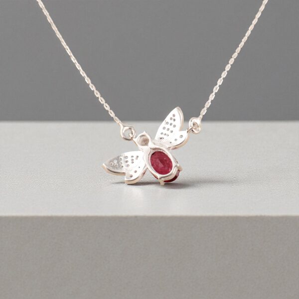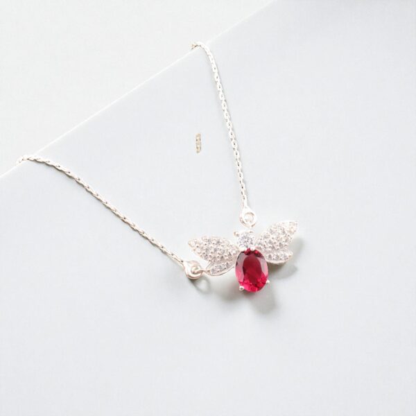 Handcrafted in pure 925 sterling silver, this pendant features a stunning butterfly silhouette adorned with sparkling crystals and a vivid scarlet gemstone at the center — capturing light with every movement.
