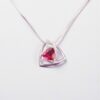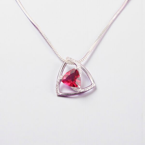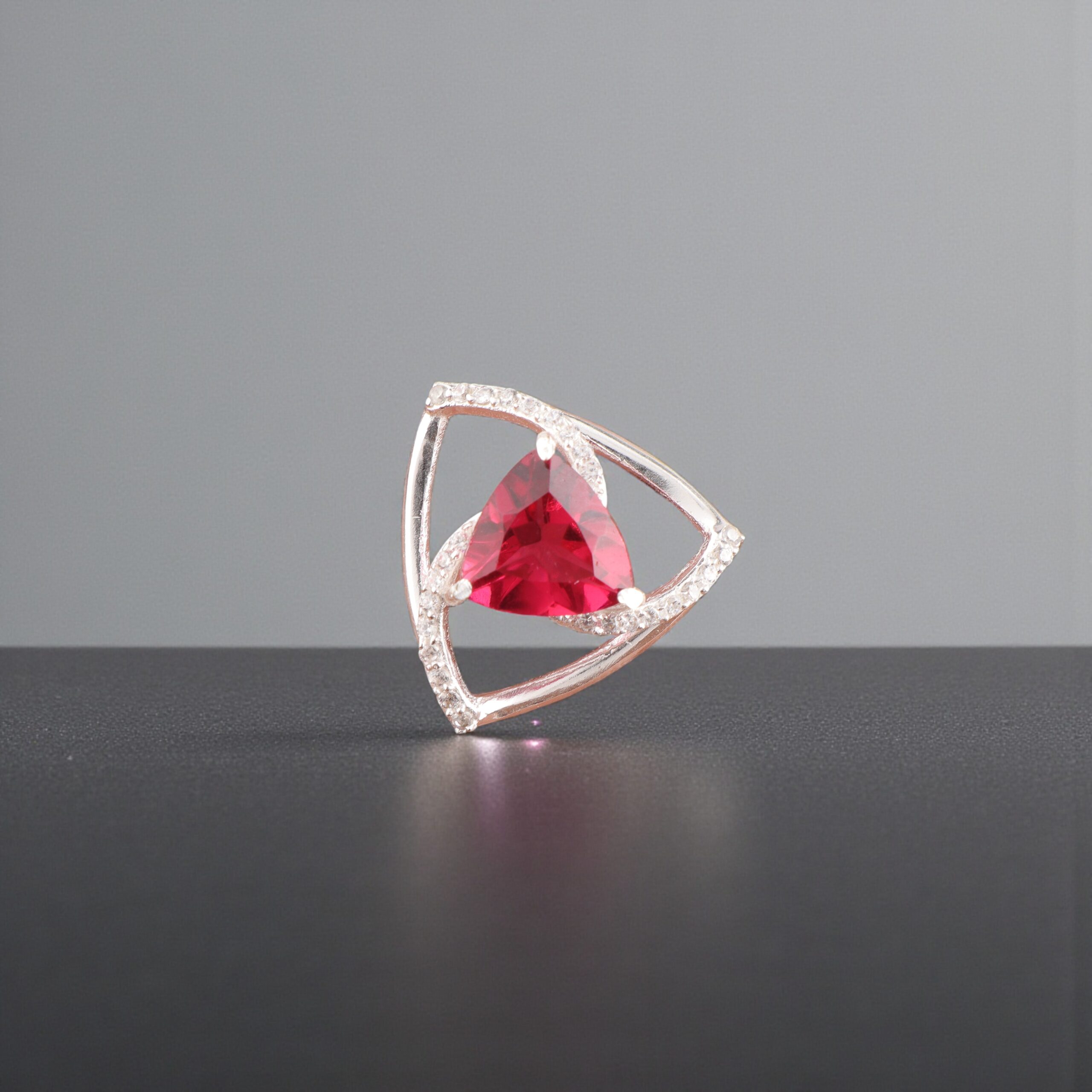 Introducing the Sevara Scarlet Spark Pendant, a radiant symbol of passion and elegance. Featuring a stunning trillion-cut scarlet gemstone, this pendant captivates with its vibrant depth and fiery brilliance. The stone is framed within an artistic triangular halo design, adorned with shimmering crystals that add an irresistible sparkle to every angle.