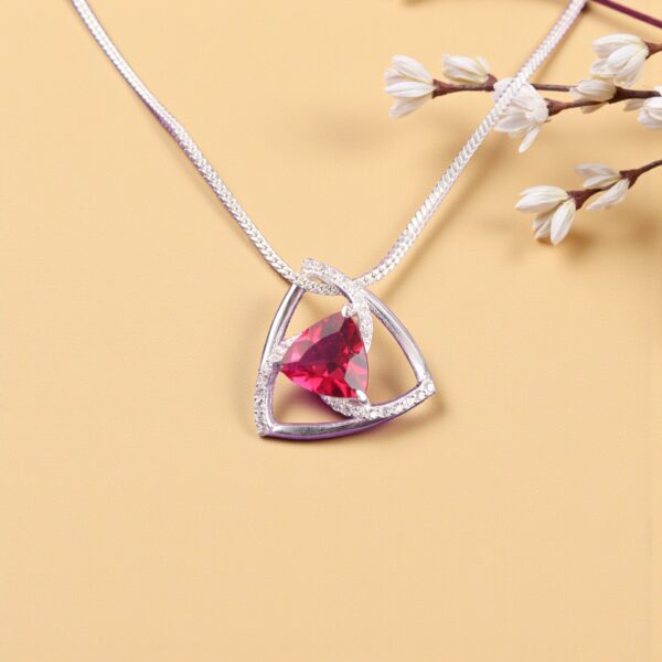 Crafted in 925 sterling silver, the pendant offers durability, shine, and elegance while remaining gentle on your skin. Its modern geometric silhouette combined with the romantic red gemstone makes it perfect for both everyday wear and special occasions.